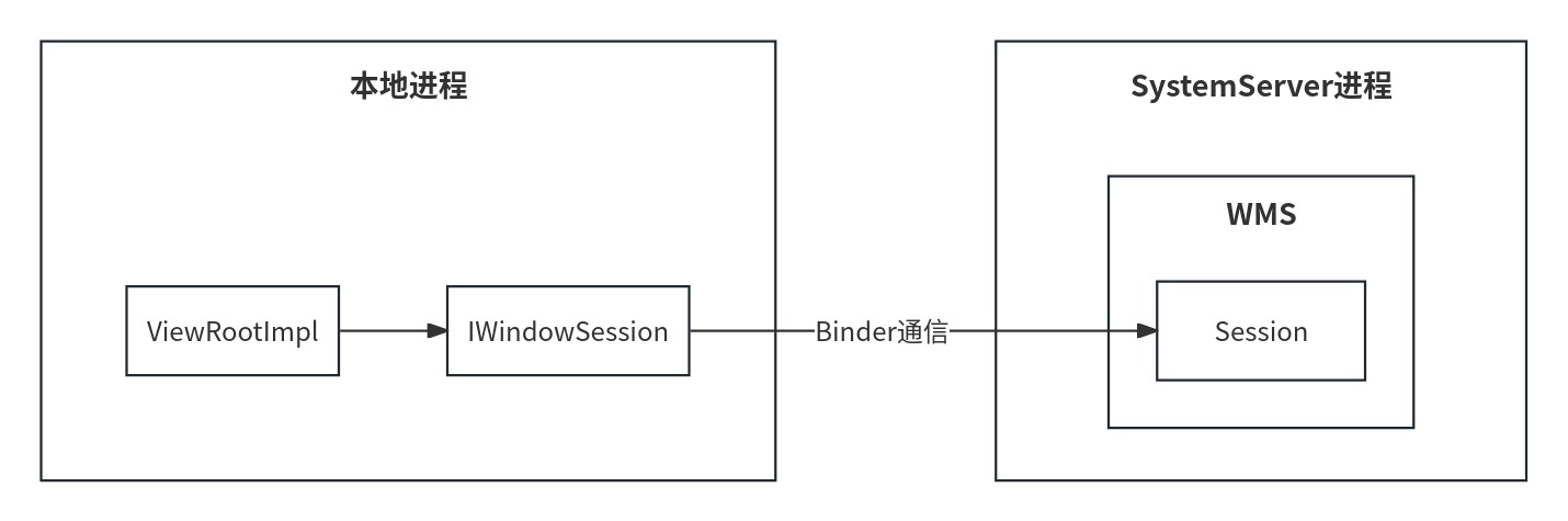 调用mWindowSession的addToDisplayAsUser()方法,mWindowSession是IWindowSession类型的,它是一个Binder对象,用于进行进程间通信,IWindowSession是Client端的代理,它的Server端的实现为Session,此前的代码逻辑都是运行在本地进程的,而Session的addToDisplayAsUser()方法则运行在WMS所在的进程(SystemServer进程)中。