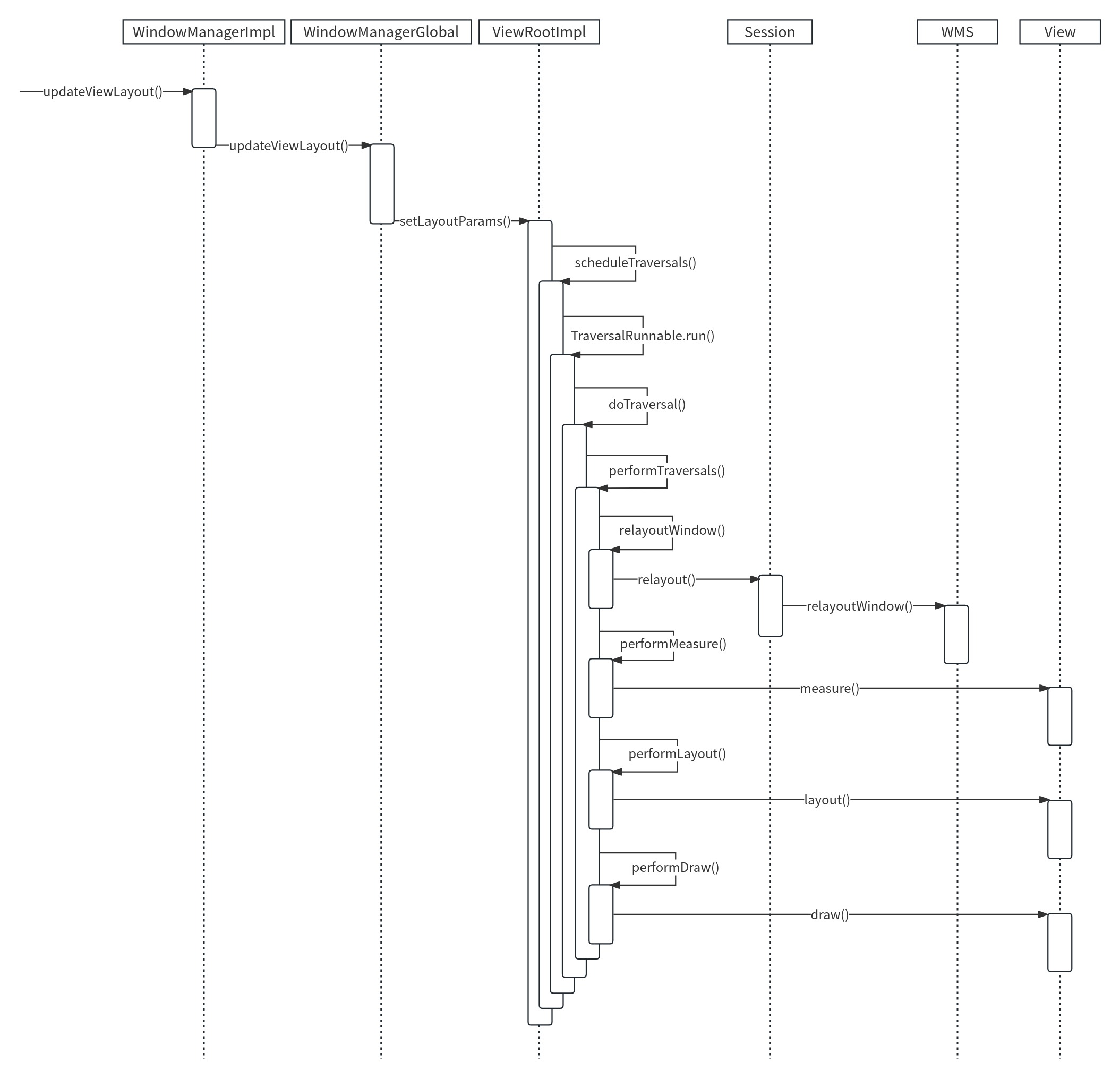 注释4和5处用于更新布局参数列表,注释6处调用ViewRootImpl的setLayoutParams()方法将更新的参数设置到ViewRootImpl中。