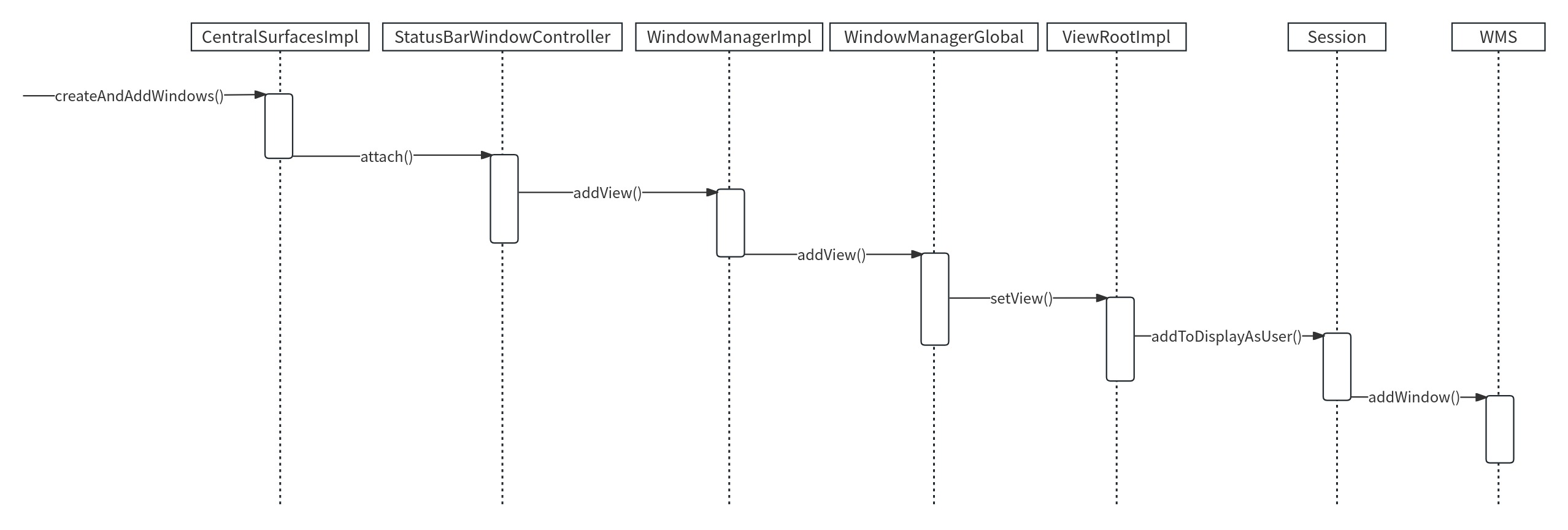 1 2 3 4 5 6 frameworks/base/packages/SystemUI/src/com/android/systemui/statusbar/phone/CentralSurfacesImpl.javapublic void createAndAddWindows (@Nullable RegisterStatusBarResult result) { makeStatusBarView(result); mNotificationShadeWindowController.attach(); mStatusBarWindowController.attach(); }